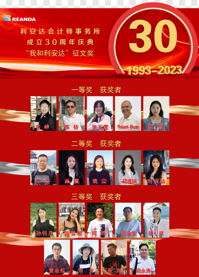 為了隆重慶祝利安達會計師事務所成立30周年,利安達三屆十次管委會決議在全球范圍內(nèi)開展“我和利安達”有獎征文活動,并在內(nèi)部刊物-《利安達縱橫》上辟出版面刊登。征文活動發(fā)布后,得到了全球利安達員工的積極響應,共收到74篇文章、詩歌、書法和繪畫作品。經(jīng)過利安達成立30周年籌備領導小組評選,共評選出優(yōu)秀作品一等獎5名、二等獎5名、三等獎9名。這些優(yōu)秀作品和作者分別是: