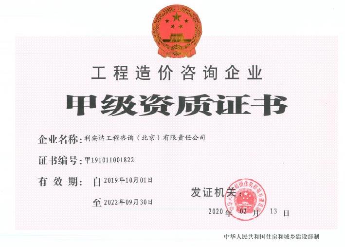 利安達工程咨詢(北京)有限責任公司(以下簡稱“我公司”)前身為利安達工程咨詢(天津)有限責任公司,成立于2004年11月23日,并于2010年9月經(jīng)建設部批準取得工程造價咨詢甲級資質,注冊地為:天津市紅橋區(qū)。2019年5月我公司啟動跨省遷移工作,并于2020年2月辦理完成遷移工作。遷京后注冊地址為北京市朝陽區(qū)慈云寺北里210號樓11層1101內04單元,注冊資金500萬元,黃錦輝先生為公司法定代表人。甲級資質證書編號為甲191011001822。主要經(jīng)營范圍:工程造價咨詢服務、工程招標代理服務、工程咨詢。(依法須經(jīng)批準的項目,經(jīng)相關部門批準后依批準的內容開展經(jīng)營活動)。