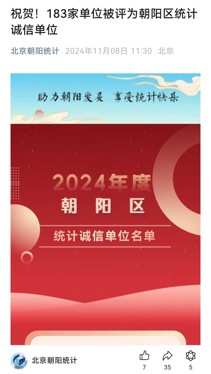 2024年11月8日,北京市朝陽區(qū)統(tǒng)計局公布了2024年朝陽區(qū)統(tǒng)計誠信單位名單,利安達(dá)會計師事務(wù)所(特殊普通合伙)榮幸地被評選為“統(tǒng)計誠信單位”企業(yè)。為營造依法統(tǒng)計、誠實守信的良好氛圍,提高各單位對統(tǒng)計工作的重視程度和工作積極性,經(jīng)過嚴(yán)格篩選認(rèn)定,2024年度朝陽區(qū)共有183家單位被評定為朝陽區(qū)統(tǒng)計誠信單位。
